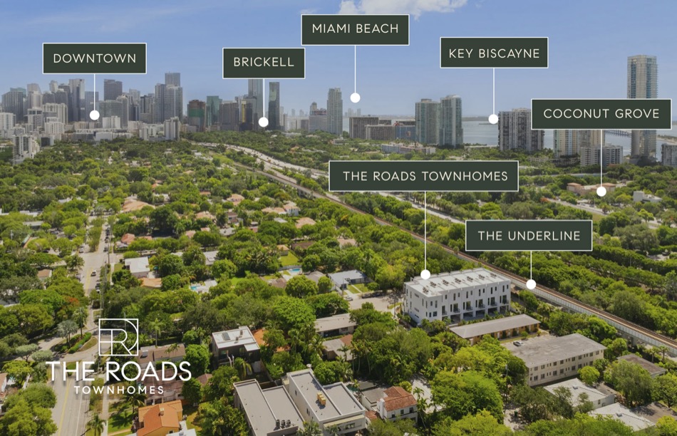 The Roads located in an area of Miami Dade County Florida known as the Roads, just North of US1 and West of Brickell. The Roads will consist of 7 luxury townhouse units in a single master planned building on a passive park known as the Underline with it lush lighted landscape bike and pedestrian paths.
